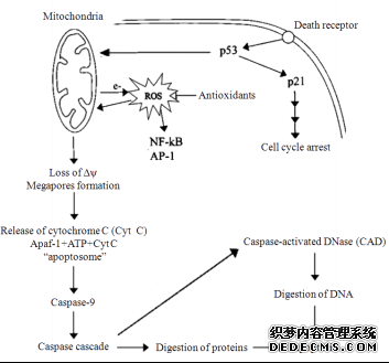 2  由線粒體產生的活性氧介導的細胞凋亡示意圖(根據參考文獻[50]修改)